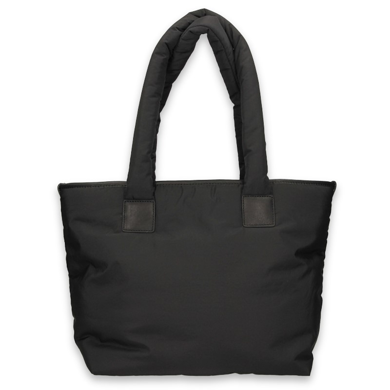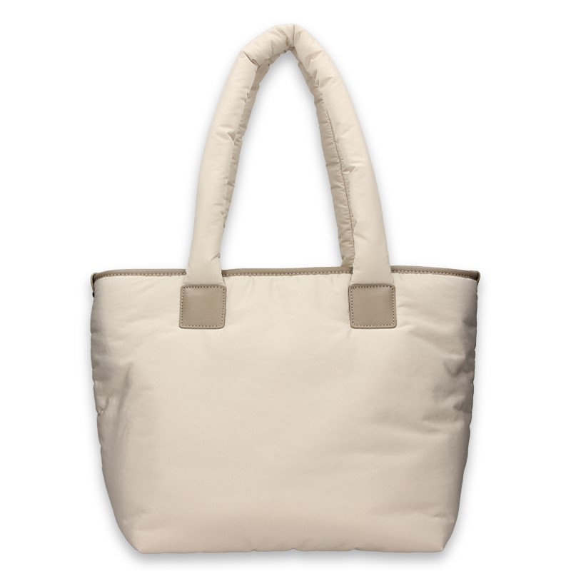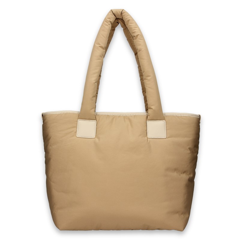 A4-format trapeze shopper crafted from soft padded fabric with a peach-skin texture.