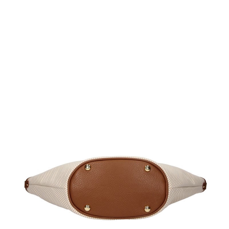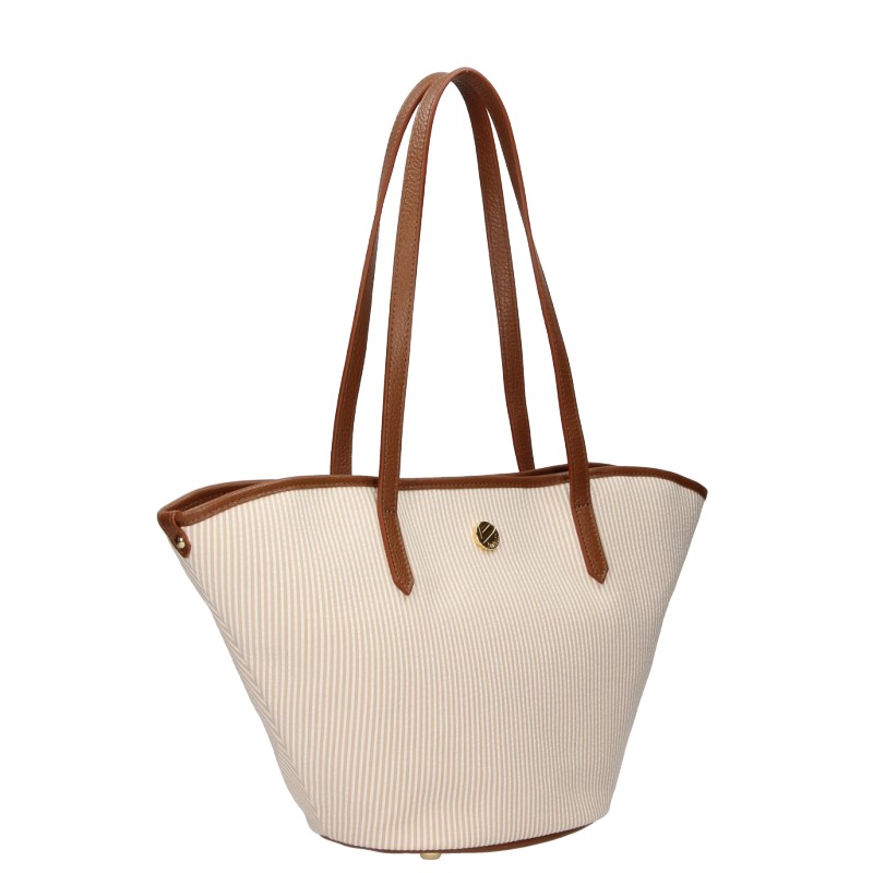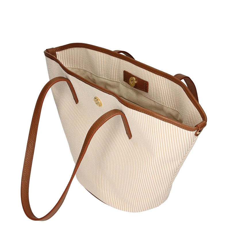La borsa Brezza esprime uno stile leggero e rilassato, perfetto per accompagnare le giornate estive con naturale eleganza. Realizzata in cotone seersucker rigato, un tessuto fresco, leggero e traspirante, caratterizzato da una texture mossa e tridimensionale, dona al modello un aspetto luminoso e dinamico. Le finiture in pelle martellata a contrasto definiscono il design con un tocco raffinato. La sua silhouette ampia e aperta, con sviluppo orizzontale, offre grande capienza mantenendo una sensazione di leggerezza, ideale per il tempo libero, la città e le giornate fuori porta. I manici lunghi permettono una comoda portabilità a spalla, mentre l’interno, completamente foderato, è dotato di una tasca chiusa con zip per organizzare al meglio gli oggetti personali. Spaziosa, fresca e versatile, è la borsa ideale per vivere la stagione estiva con praticità e stile.