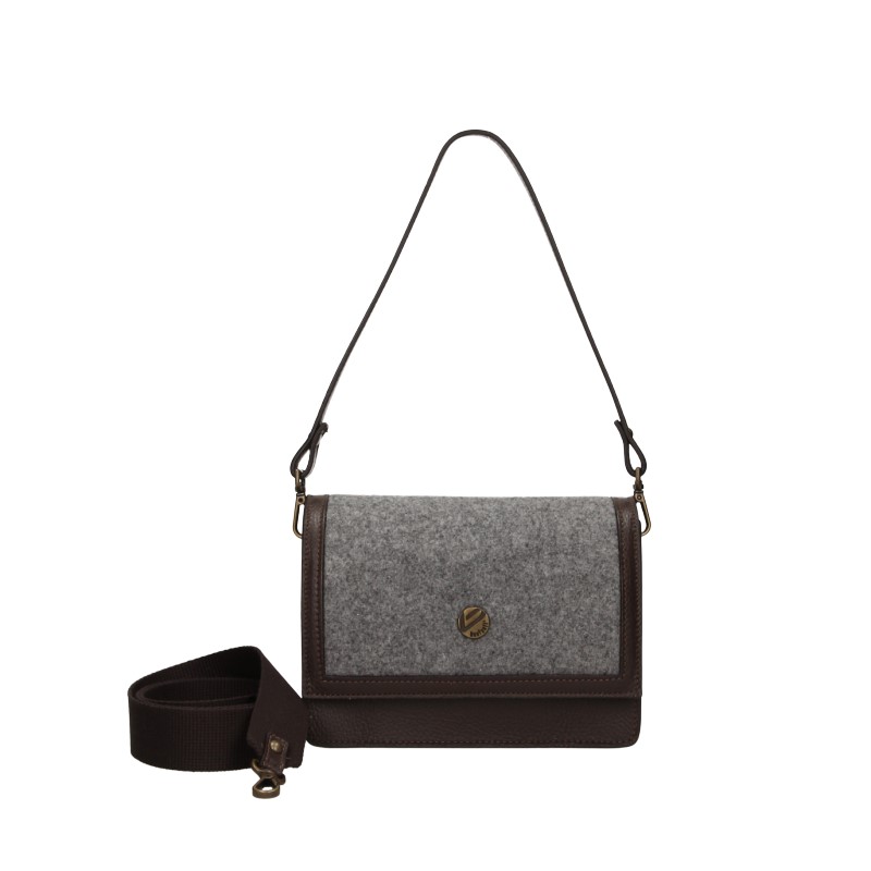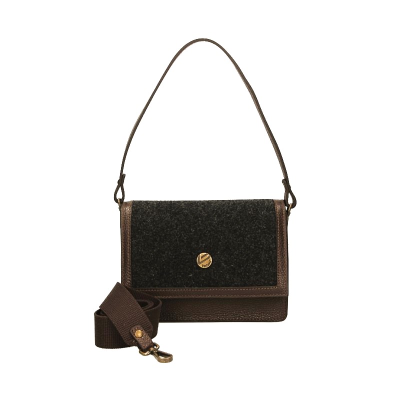 La Mini Tracolla é realizzata in Feltro di lana, finiture in pelle a grana dollaro color testa moro. La doppia vestibilità é garantita dalle due tracolle: una mini tracolla in pelle per un look essenziale, una lunga tracolla a nastro per un look più sbarazzino. Patella chiusa da calamita. Internamente dotata di un comodo taschino chiuso con zip.